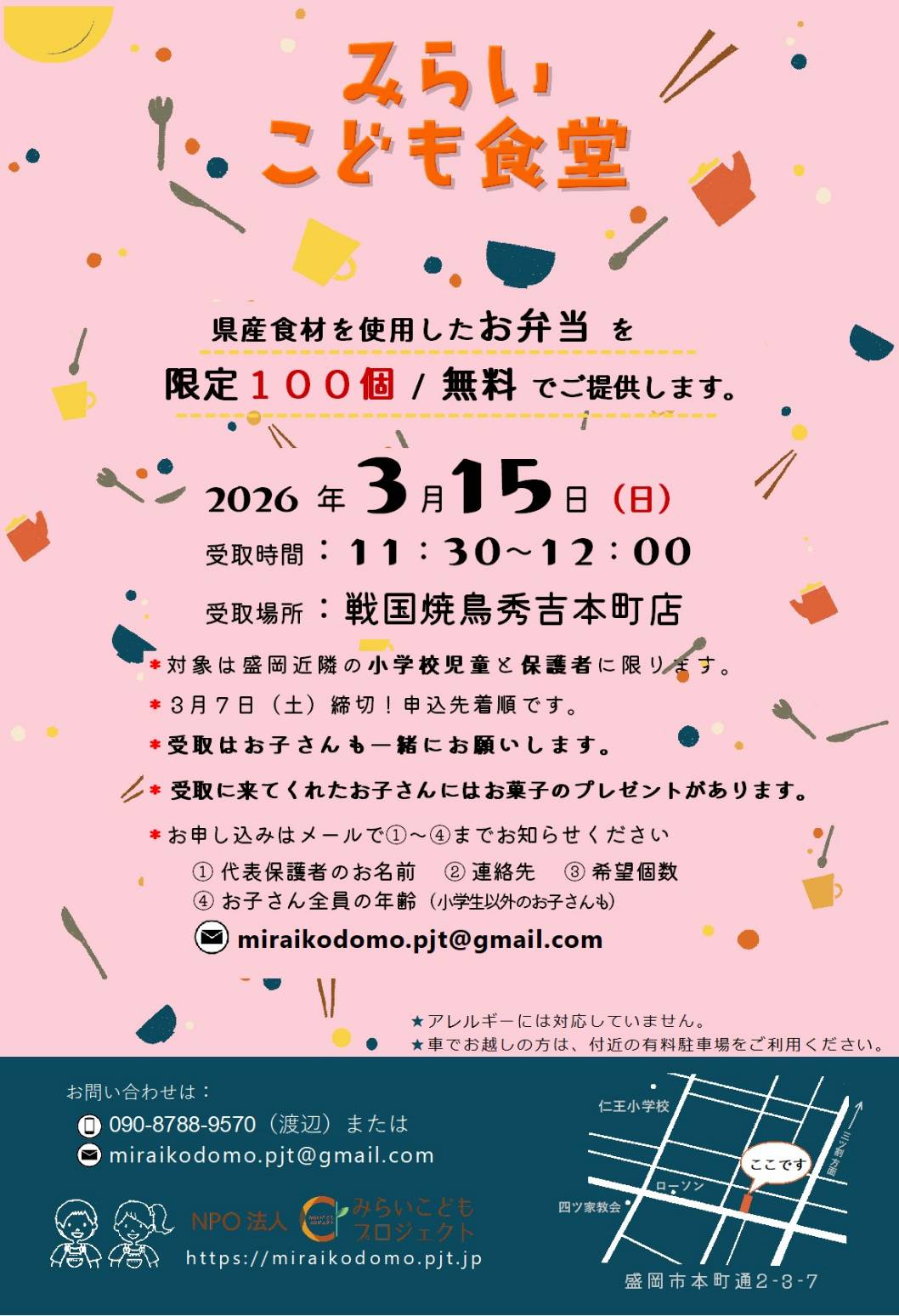 第52回【みらいこども食堂】2026年3月15日(日) 『岩手県産食材使用弁当配布』のご案内