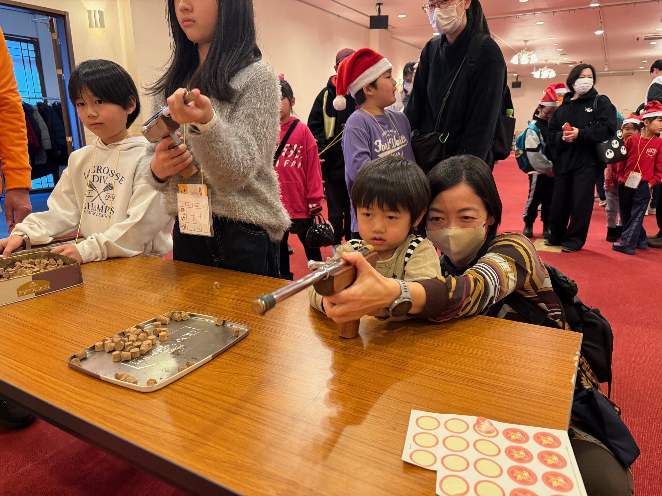 餅つき、射的、ストラックアウト、ビンゴ大会など沢山遊んで体験して、ケーキやチキンのお土産もありで、子どもたちの笑顔が沢山でした。